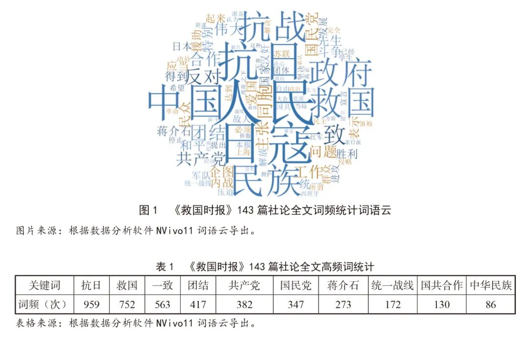 《救国时报》在存续的两年多时间里,共发行152期报纸,现存144期。其中,143篇社论的高频词语云与词语如图1、表1所示。