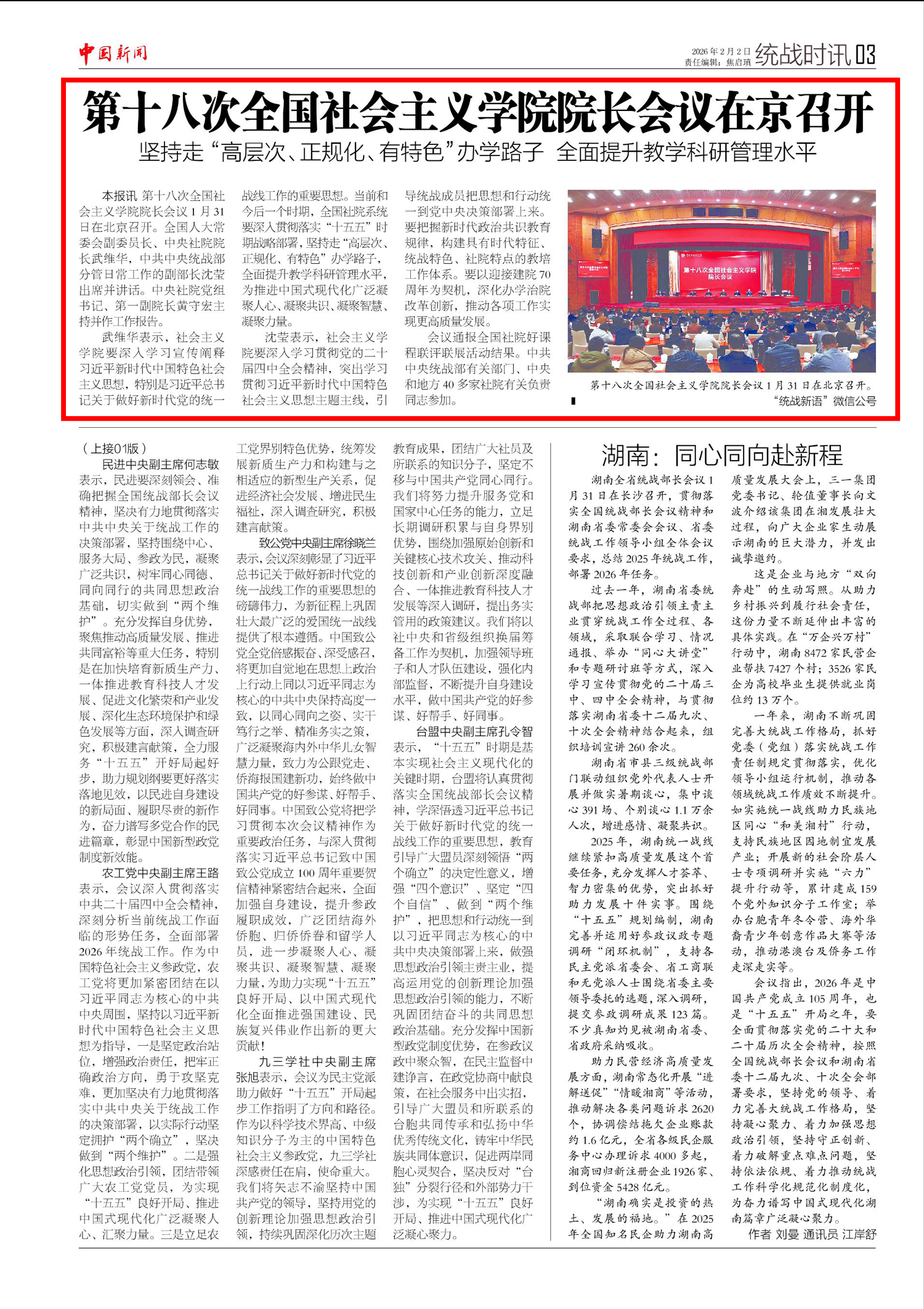 武维华表示,社会主义学院要深入学习宣传阐释习近平新时代中国特色社会主义思想,特别是习近平总书记关于做好新时代党的统一战线工作的重要思想。当前和今后一个时期,全国社院系统要深入贯彻落实“十五五”时期战略部署,坚持走“高层次、正规化、有特色”办学路子,全面提升教学科研管理水平,为推进中国式现代化广泛凝聚人心、凝聚共识、凝聚智慧、凝聚力量。