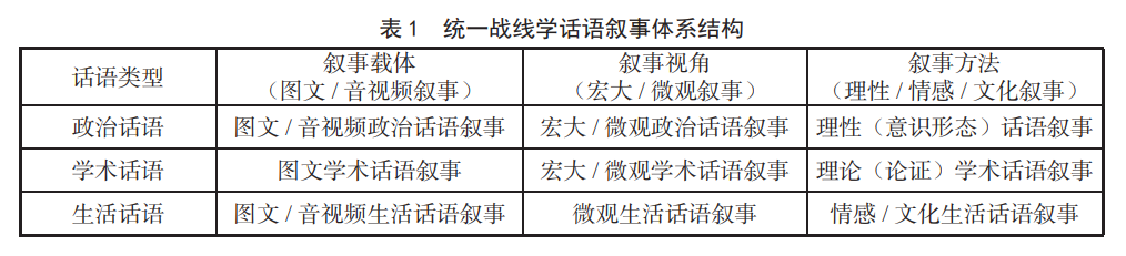 第二,创新统一战线话语叙事体系。话语是叙事的内核,叙事是话语的形式,知识需要被人们广泛接受和认同,就要借助一定的叙事手法,将话语的内核通过故事的方式表达。叙事通过构建故事世界,将价值观渗透在故事结构中,比理论话语更注重形塑力。统一战线话语叙事是以政治话语、学术话语和生活话语为基本构成样态,以文本、语言、图像、符号、情感为载体建构话语权力的意识形态言语符号系统(见表1)。一方面,坚持“两个结合”讲好“中华民族共同体”的团结故事。好的故事必须是让人听得懂、使人产生共鸣的故事。在中华民族的文明史中,在中国共产党带领中国人民百年奋斗的征程里,涌现出无数可歌可泣、感天动地的团结佳话,这些故事成为讲述中华民族共同体的生动案例与鲜活素材。另一方面,讲好新时代的团结故事,要充分运用、科学吸收中华优秀传统文化中蕴含的团结话语叙事元素,用马克思主义基本原理对这些元素进行现代化转化;要善用微观情感叙事、个体叙事和生活叙事,也要科学运用国家宏大叙事、民族叙事、文化叙事和时空叙事等多种叙事方式,找准情感共鸣点、利益交汇点,唤醒海内外中华儿女内心深处的民族情结与历史记忆,增进情感认同,形成以理服人、以情感人、情理交融的话语体系。此外,还要强化技术赋能,以数智化技术推动统一战线话语叙事的创新发展。